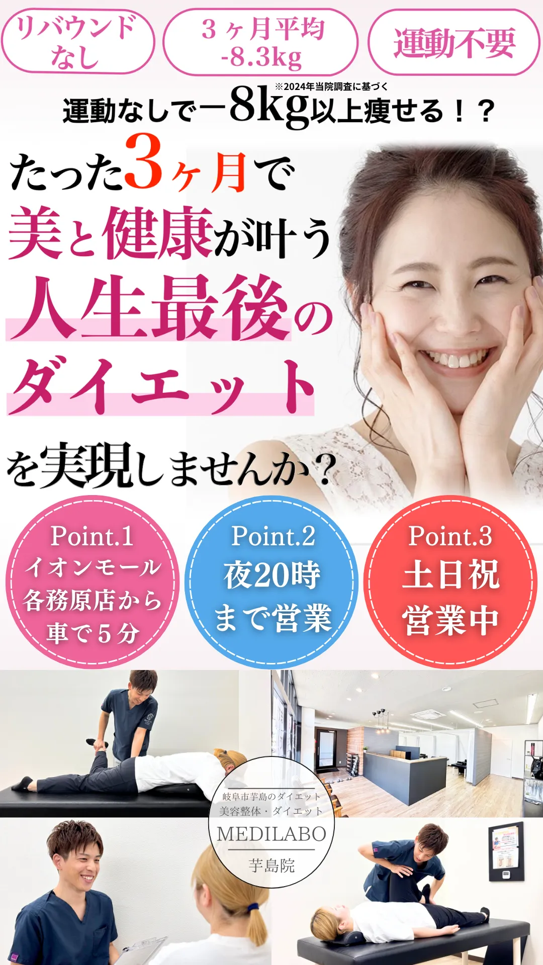 ダイエットのプロとしての証である資格を保有し、数多くのお客様から支持され、あなたの悩みに真正面から向き合う、MEDILABO芋島院に来院し、健康と美容の先にある理想の自分を叶えて心から思いっきり楽しめる人生を手に入れる道。